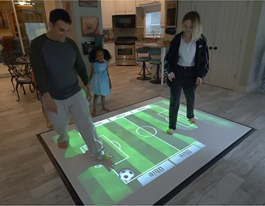 Play dozens of interactive games by moving around on a designated floor screen